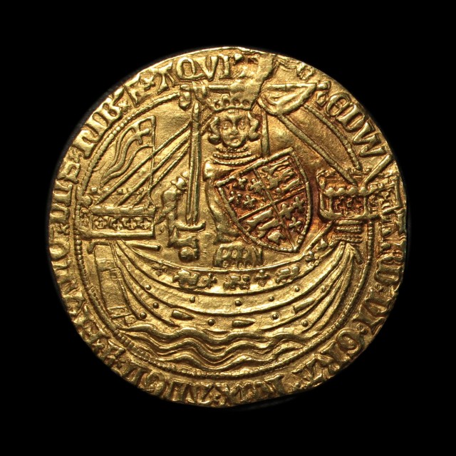 Calais mint, French title, king holding sword standing in ship, flag at stern, saltire stops, rev. E and pellet in centre, double saltire stops, mm. cross pattee, 7.61g, (S.1521, N.1281). Good very fine