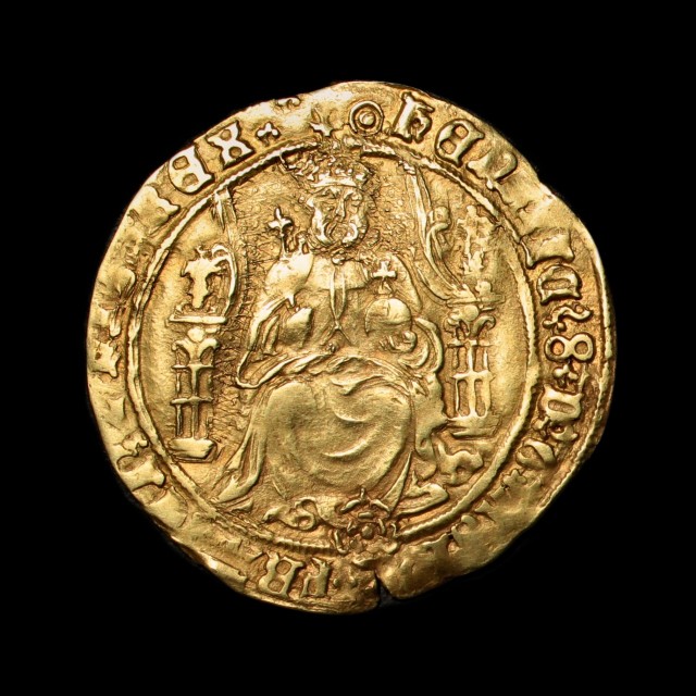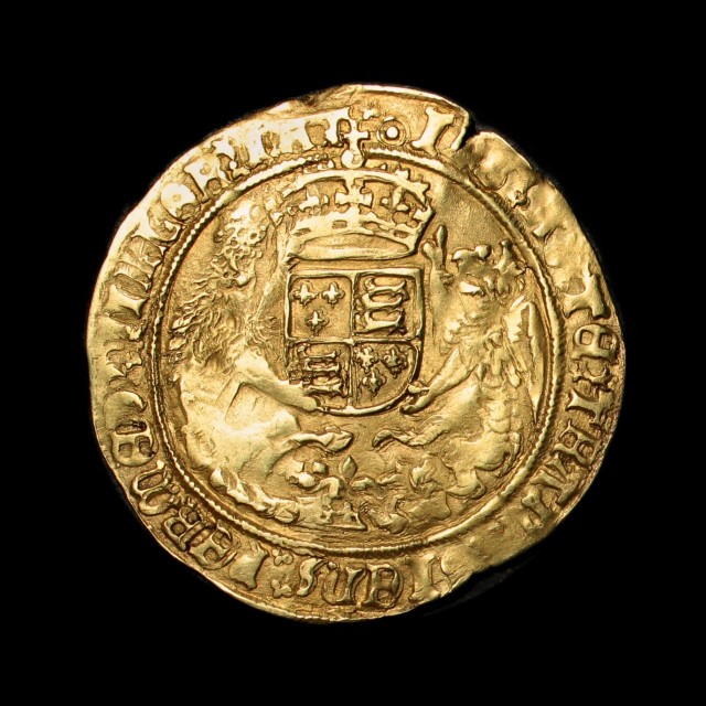 Tower mint, king enthroned holding orb and sceptre, Tudor rose below, rev. crowned shield between lion and griffin supporters, HR below, mm. pellet-in-annulet, 6.05g, (S.2294, N.1829). Some weakness of strike to the legends in places but with a much stronger portrait than often for this issue, very fine or better
