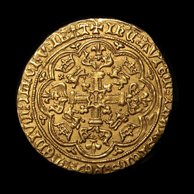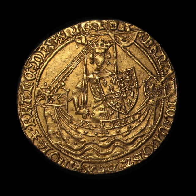 King in ship, trefoil on ship's hull, rev. pellet and h in centre, trefoil in first quarter, 7.04g, (S.1715, N.1355). Slightly weakly struck on the king's face, otherwise good very fine and very rare