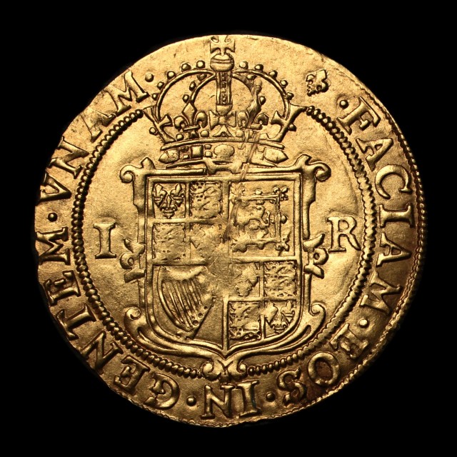 Unites valued at 20 shillings or one pound were first produced during the reign of King James I. The coin was named after the legends (rev: FACIAM EOS IN GENTEM UNAM - "I will make them one nation") on the coin indicating the king's intention of uniting his two kingdoms of England and Scotland. The value was increased to 22 shillings in 1612 due to an increase in the value of gold throughout Europe.