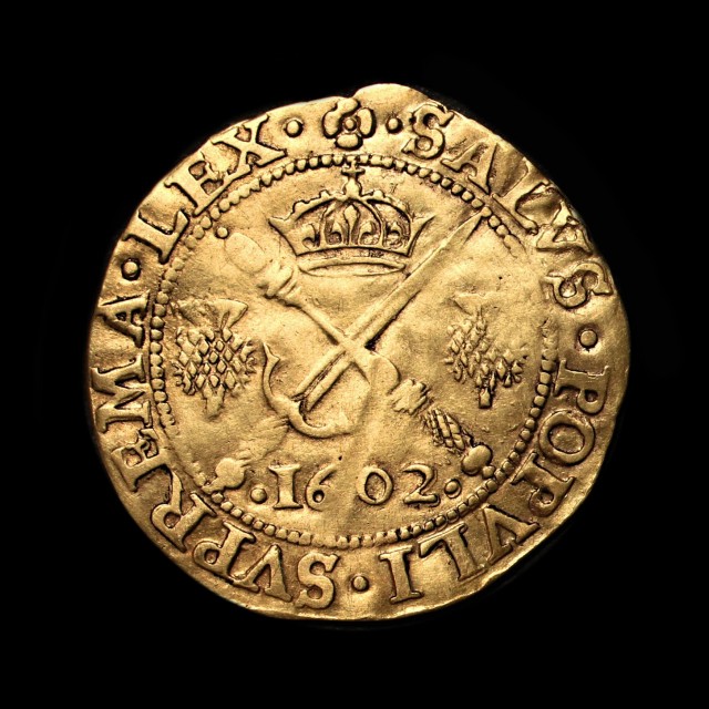 1602, crowned shield of arms, rev. crossed sword and sceptre between thistles, crown above, date below, 4.80g, (S.5460). Good fine to nearly very fine