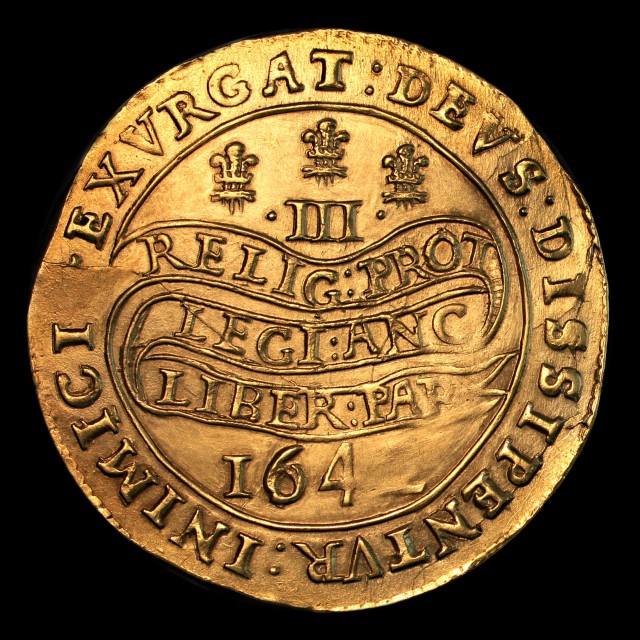 The Spink standard catalogue has incorrectly changed in recent years for this issue. Spink 2724 and 2725 are now separated by date, S.2724 being 1642 and S.2725, 1643. It is not simply that 1643 is rarer than 1642, it is rather that the continuous scroll is rarer than the scroll in three lines when paired with this bust. This coin should therefore be S.2725 and is far rarer than the 1642 coin with the scroll in three lines.