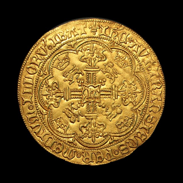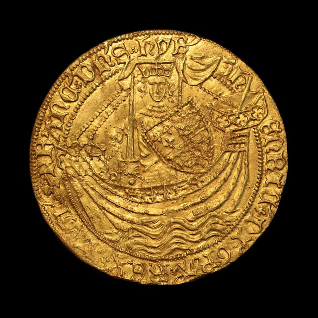 London mint, king standing in ship facing, holding sword and shield, annulet by sword arm, rev. annulet stops, ornate cross with lis terminals, h in centre of cartouche, crown over lion in each angle, tressure of eight arcs with fleurs in spandrels, annulet in spandrel in second quarter, 6.99g, (S.1799, N.1414). A few minor scuffs and marks (probably a field fine at some point), otherwise full and about extremely fine