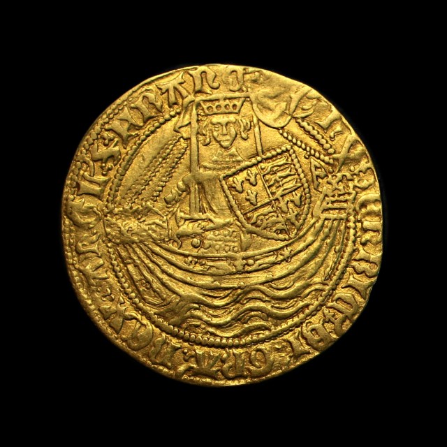 London mint, king standing in ship facing, holding sword and shield, annulet by sword arm, rev. ornate cross with lis terminals, h in centre of cartouche, crown over lion in each angle, tressure of eight arcs with fleurs in spandrels, annulet in one spandrel, mm. -/lis, (S.1805, N.1417). Full, round and very fine