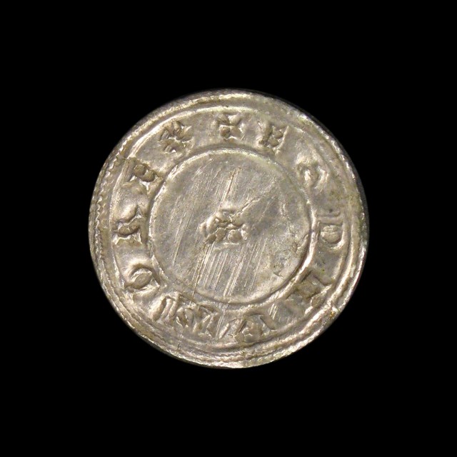 Reverse with annulet between two crosses with a trefoil of pellets above and below. A previously unlisted moneyer, 1.31g (s.1105, N.-). Lightly bowed but a pleasing VF, extremely rare, possibly unique.