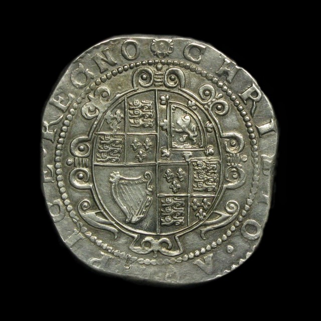 mm. rose, round shield with five short and two long scrolls, (S.3065, N.2550/1). Portrait and legend a little soft in places but much as struck, a good example.