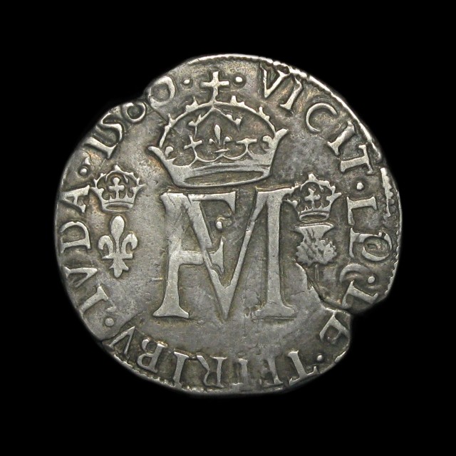 1560, crowned arms of Francis and Mary, rev. crowned FM monogram, 5.84g (S.5418). Metal starvation in striking causing flan cracks, otherwise attractively toned and very fine.