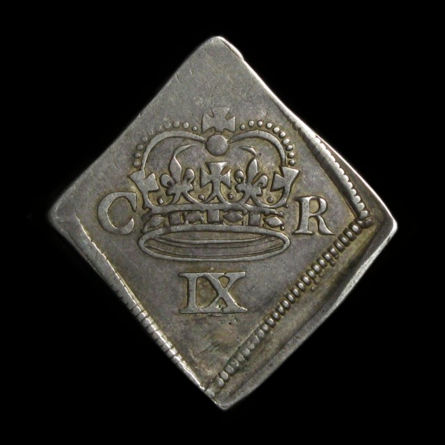 Lozenge, large crown between CR, mark of value below. Rev. OBS: NEWARK (S.3144, N.2641). Previously pierced at the bottom below mark of value, plugged otherwise very fine and quite well centred.