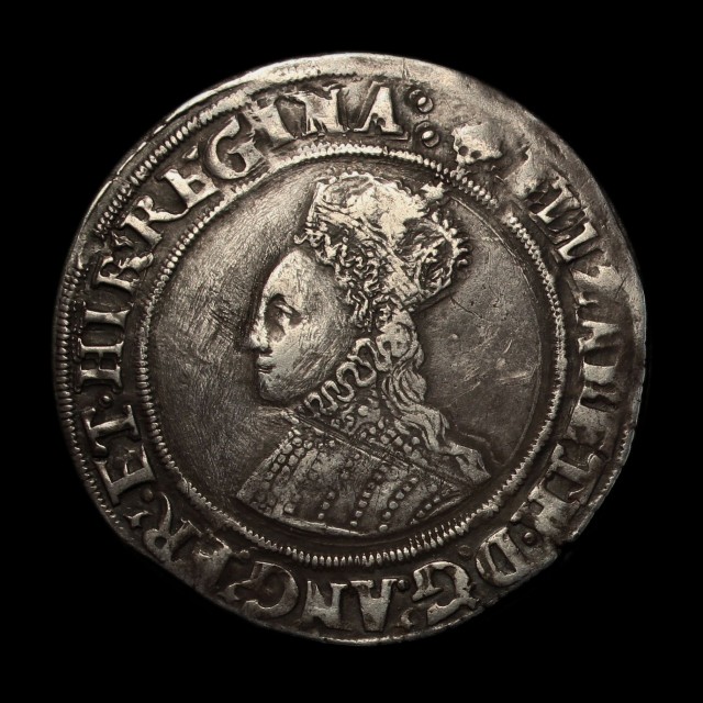 Large bust left with pearls on bodice, rev. long cross fourchée over shield, mm. cross crosslet, 6.06g, (S.2555A, N.1985). Tooled on the queen's face and the field in front of face, still a reasonably attractive and full example of this scarce bust.