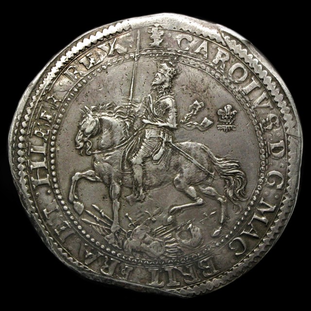The superb die work of this piece is by Thomas Rawlins, pupil of Briot, who was appointed Graver of the Seals, Stamps and Medals at Oxford in 1643. The following year he produced dies for the celebrated 1644 Oxford crown, which shows a view of the city of Oxford behind the horseman and the 1644 pound with the date in cartouche which was struck from the same obverse die as the example offered here.