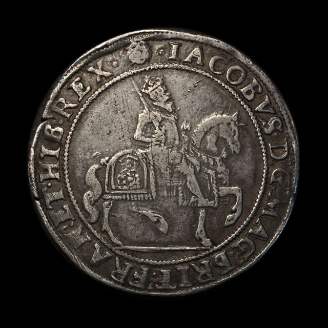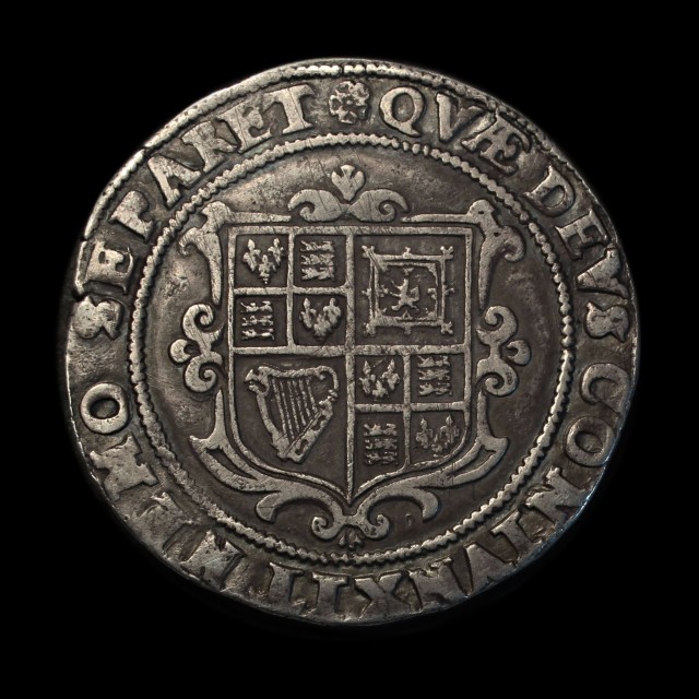 King of horseback right, plain ground below, rev. square topped shield, mm. seeded rose/small rose, 14.74g, (S.2666, N.2122). Toned and well-struck on a full flan, pleasing very fine and extremely rare with this mint mark