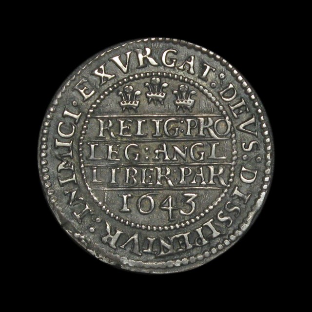 1643, three Shrewsbury plumes to reverse, mm. book/-, 2.99g, reverse declaration reads RELIG: PRO LEG: ANGL LIBER: PAR, (S.2981, N.2459). Nearly extremely fine with a deep even tone, a most attractive coin.