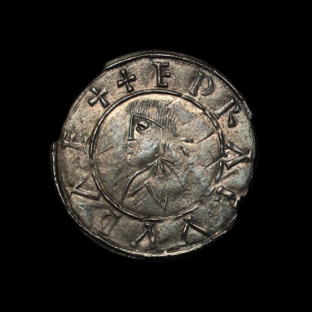 Bust left, blundered legends, +EPRΛEVVPΛE+, rev. legend in two lines, crosses between, a trefoil of pellets above and below, NEICIO IIERIO (R inverted), 1.32g, (S.1084, N.651). Minor edge chips, but with an old cabinet tone, good very fine and rare