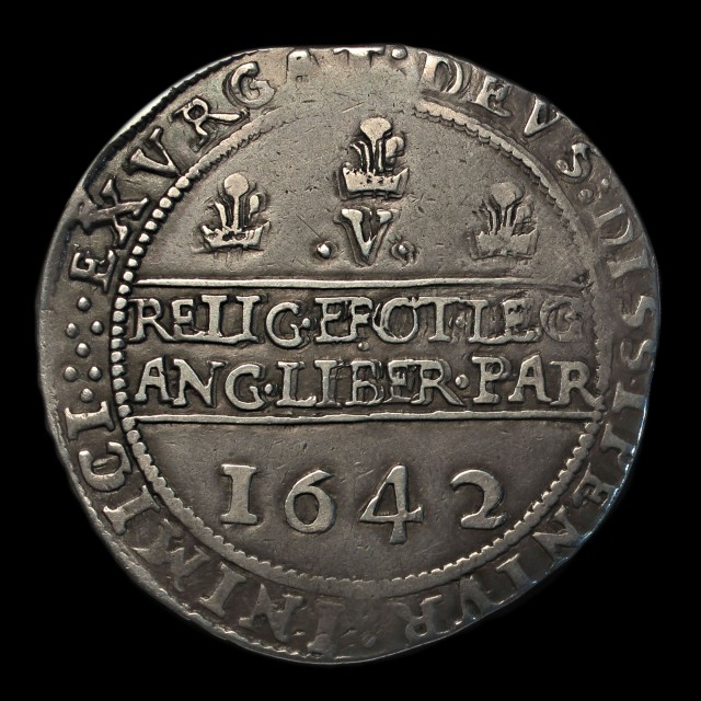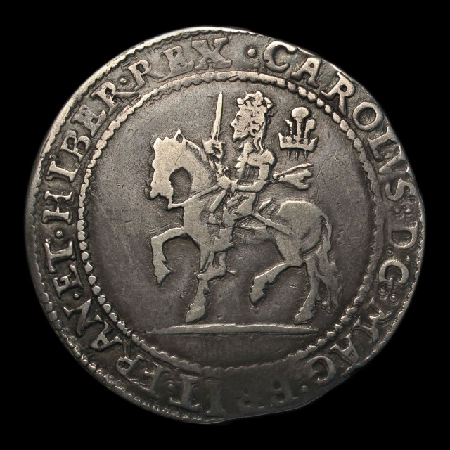 1642, Shrewsbury horseman left, ground line below, Shrewsbury plume behind, rev. declaration in two lines, date below, mark of value and three Shrewsbury plumes above, 29.68g, (S.2926, N.2370, Brooker 809 - same dies, Morr B-5). A few weaker areas of strike but with excellent fields and attractively toned, nearly very fine