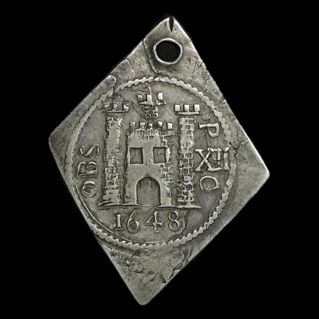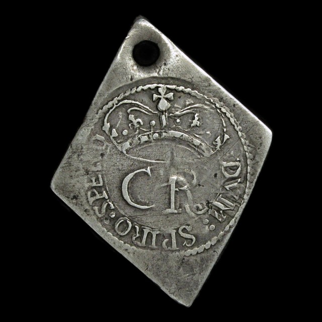 Lozenge, castle with mark of value right dividing PC (Pontefract Castle), rev. DVM:SPIRO:SPIRO, crowned CR, (S.3149, N.2647). Contemporary piercing for use as a Royalist badge, well struck and nicely toned, very fine/good very fine.