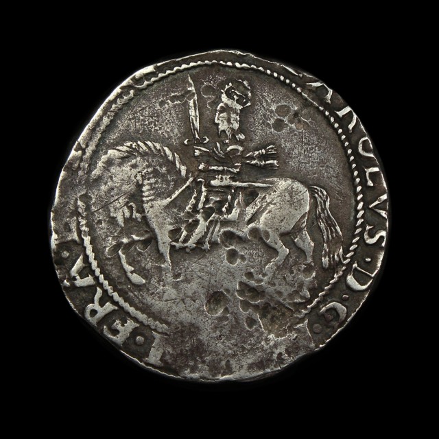 King on horse l. rev. shield with plume above, dividing CR, mm. rose, 14.18g, (S.3049, N.2540). Surface marks to obverse and slightly underweight but otherwise good fine/nearly very fine and extremely rare.