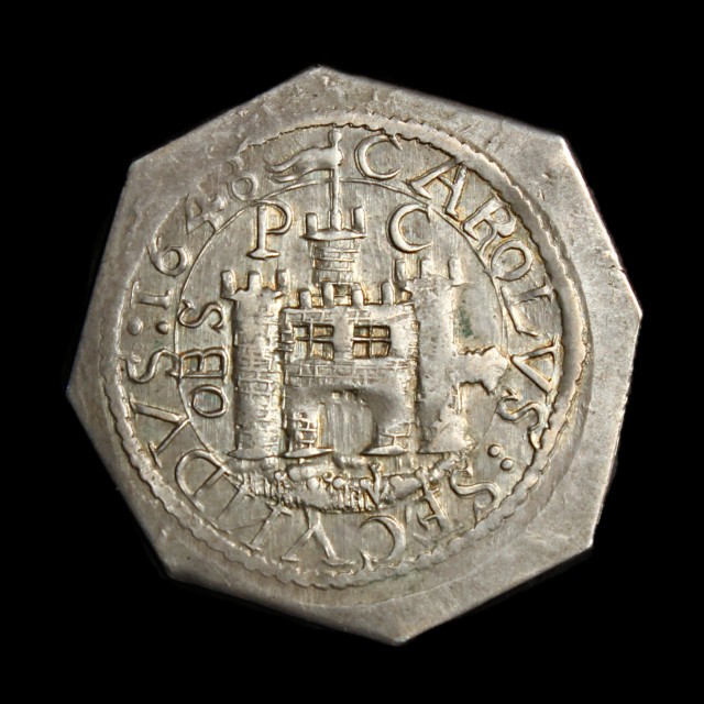 Struck after the execution of Charles I, January 30 - March 1649, in name of Charles II, castle with cannon protruding to right, flag flying above dividing PC (Pontefract Castle), to left OBS, carolvs:secvundvs:1648, letter N inverted, rev. DVM:SPIRO:SPERO, crowned CR, 4.49g (S.3150, N.2646, Brooker 1234). Well struck and about extremely fine, a superb piece with a good provenance.