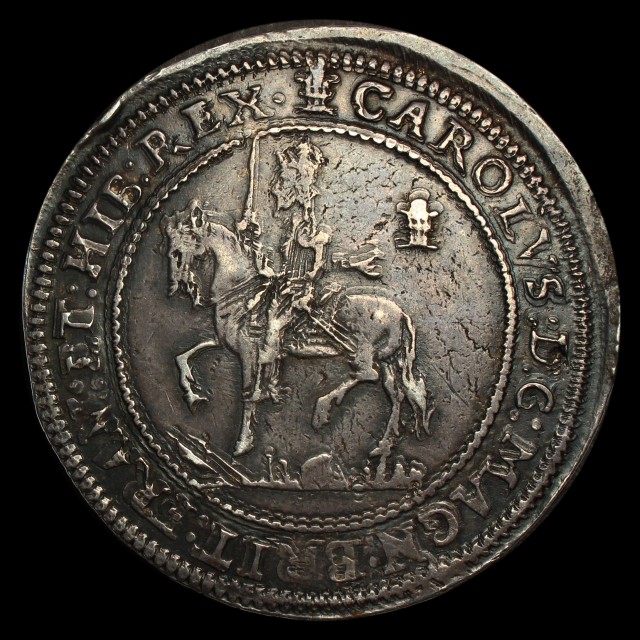 Shrewsbury horseman over arms, plume behind, rev. with three Oxford plumes above declaration, mm. plume-/, (S.2945, N.2404). Evenly struck and nicely toned, a bold good very fine.