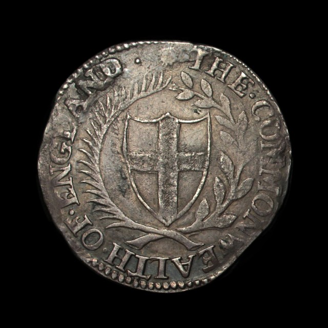 A small area of corrosion at 11 o'clock on obverse, otherwise nicely toned and very fine or better. The first year of the Commonwealth shilling and a rare date.