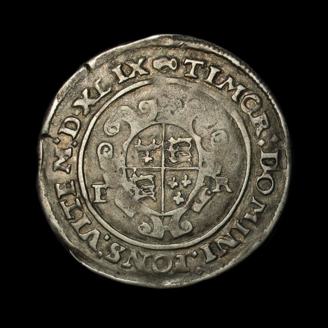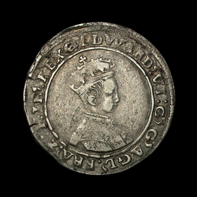 Second period, second issue, 1549, mm. grapple, bust 3, reads EDWARD;VI;G'G', rev. oval garnished shield dividing ER, 4.85g. Struck on a full round flan, attractive and very fine, the error extremely rare.