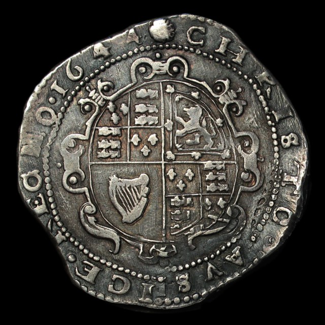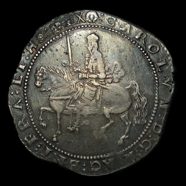 King on horseback l. holding sword, sash in large bow, mm. rose, rev. 1644 to left of mint mark, 26.90g, (S.3058, N.2557, Besley C-14). Flan a little irregular, toned and very fine.