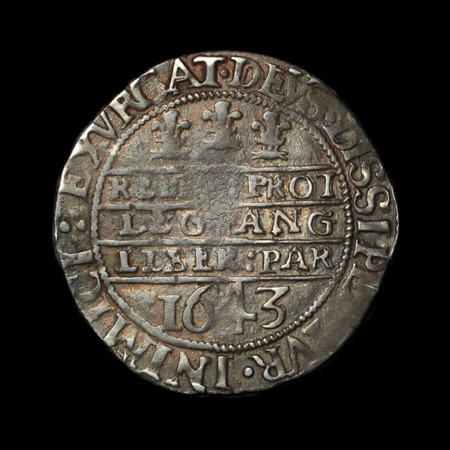 1643, Oxford bust l., mark of value behind, rev. declaration in three lines, three Oxford plumes above, date below, mm. plume/-, 5.72g, (S.2972, N.2440, Brooker 929, same obv. die; Morr. rev. 2). Well centred and quite full for this, some wekly struck areas, evenly toned and very fine.