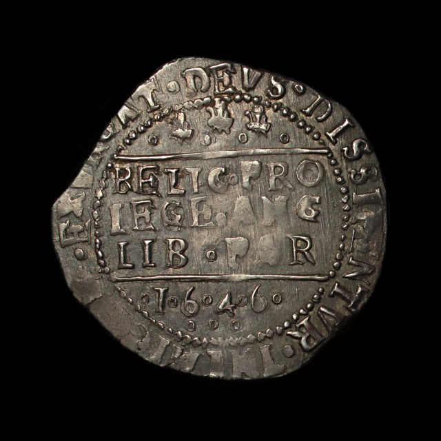 1646, crowned bust left, mark of value right, rev. protestant declaration in three lines, three plumes above date below, annulets between plumes and date, mm. Shrewbury plume/-, 6.23g, (S.2978, N.2454). Weakly struck to part of face and correspondingly on reverse but overall better than very fine.