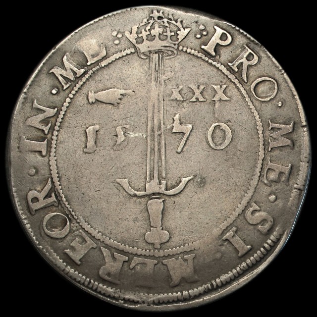 1570, crowned Scottish shield between crowned I R, rev. upright sword dividing hand and mark of value, and date, 30.10g, (S.5472). Ful, round and well struck with even wear, most appealing for the grade, good fine and better
