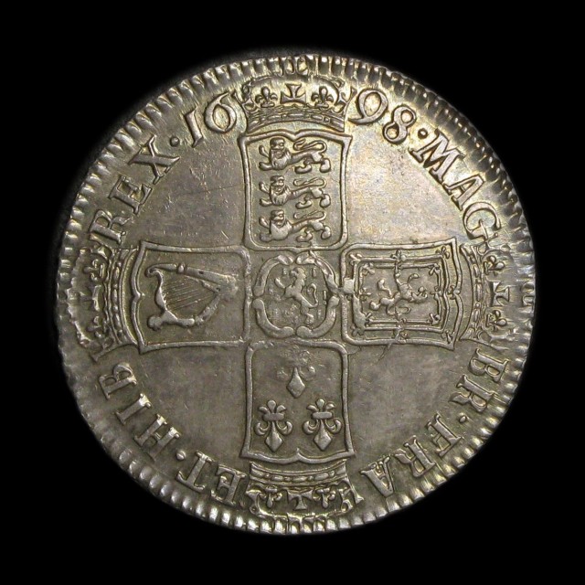 First draped bust, 1698, DECIMO to edge, modified large shields (S.3494, ESC.554)