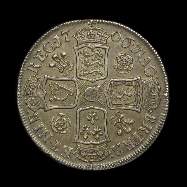 Pre-union, draped bust, roses and plumes in angles, 1706, edge QVINTO, (S.3582, ESC.573)