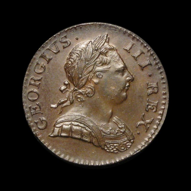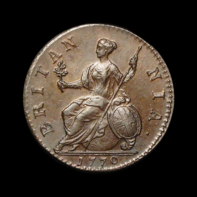 First issue, tower mint, 1770, laureate and cuirassed bust, Britannia to reverse (S.3774, Peck 893)