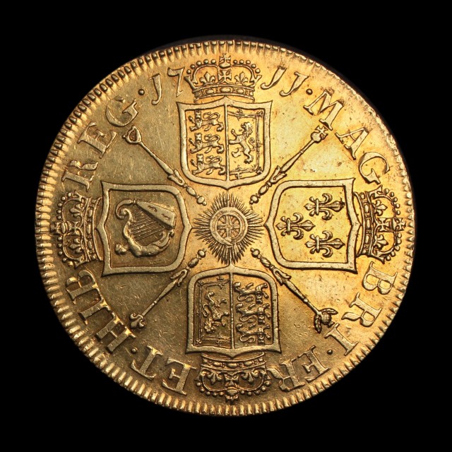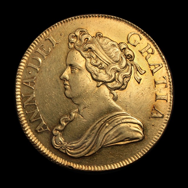 Older bust, rev. broad shields, 1714, edge D.TERTIO, (S.3568). Minor flaw on neck, attractive light tone and nearly extremely fine, rare.