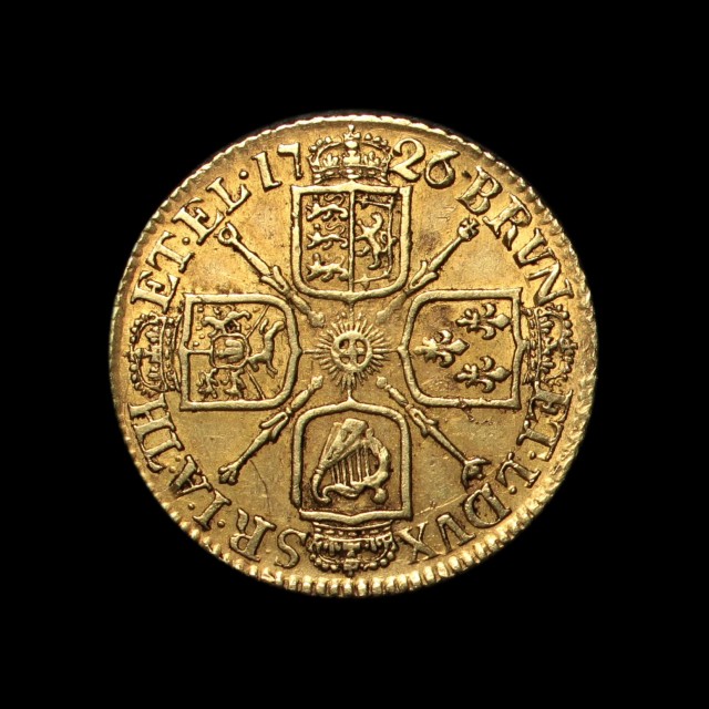 1726, fifth head right, rev. crowned cruciform shields, sceptres in angles, (S.3633)