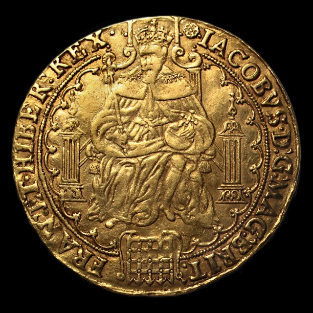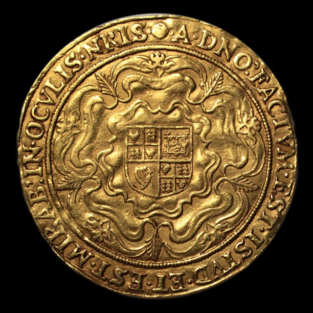 King enthroned holding orb and sceptre, IACOBVS.D:G:MAG:BRITT:FRAN:ET.HIBER:REX. rev. quartered sheild within rose, .A.DNO:FACTVM.EST.ISTVD.ET.EST.MIRAB:IN.OCVLIS.NRIS., mm. rose (1605-6), 13.30g, (S.2613, N.2079). An impressive piece, problem free and very fine.