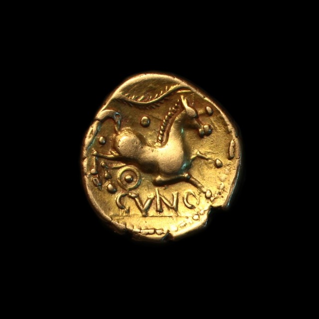 Plastic type, corn ear without stalk dividing CA MV, rev. horse right, branch above, pellet in annulet and CVNO below, 5.32g, (S.286, ABC 2786, VA 2010-1). Most attractive and nearly extremely fine