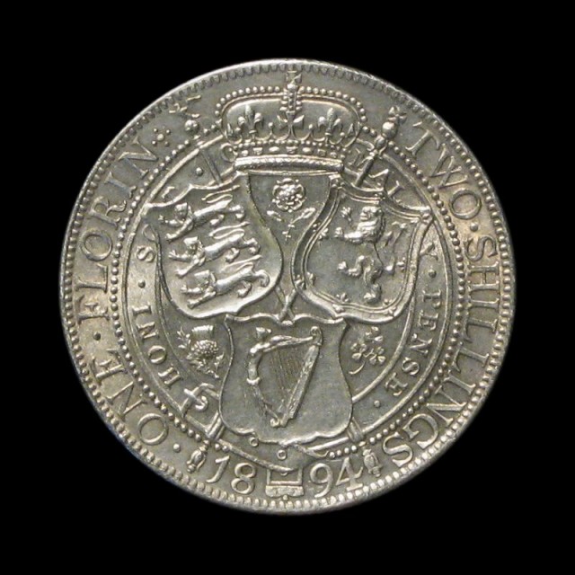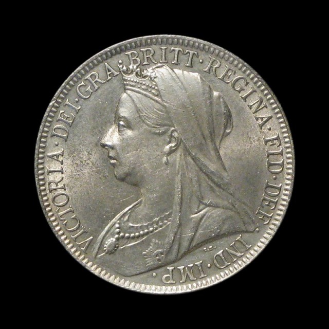 Old veiled bust, 1894, reverse three shields within garter (S.3939, ESC.878)
