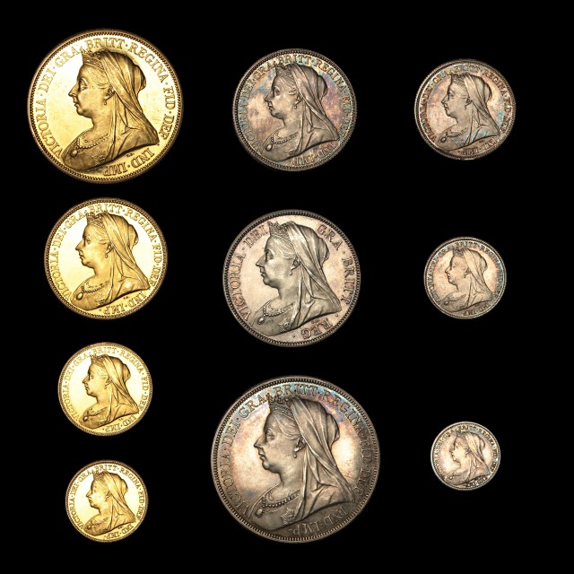 1893, jubilee head, five pounds to threepence, in case of issue, (S.PS7)