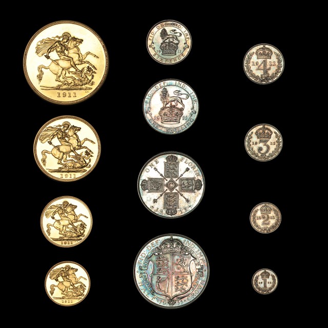 1911, bare head, five pounds to maundy penny in case of issue, (S.PS11)