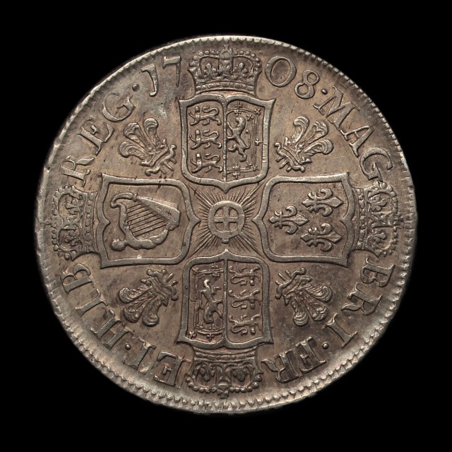 1708, draped bust left, rev. crowned cruciform shields, plumes in angles, edge SEPTIMO, (S.3606, ESC.578)