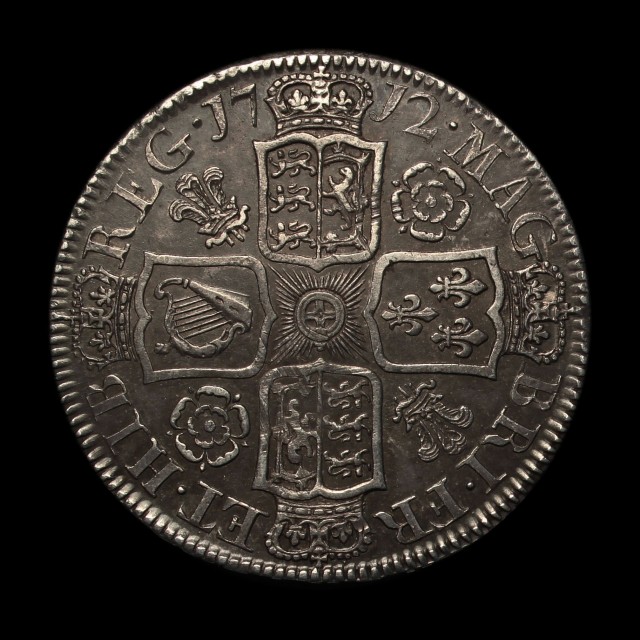 1712, draped bust left, rev. crowned cruciform shields, roses and plumes in angles, edge UNDECIMO, (S.3607, ESC.1374)