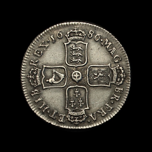 1686, laureate head left, rev. crowned cruciform shields, angles plain, (S.3410, ESC.765)