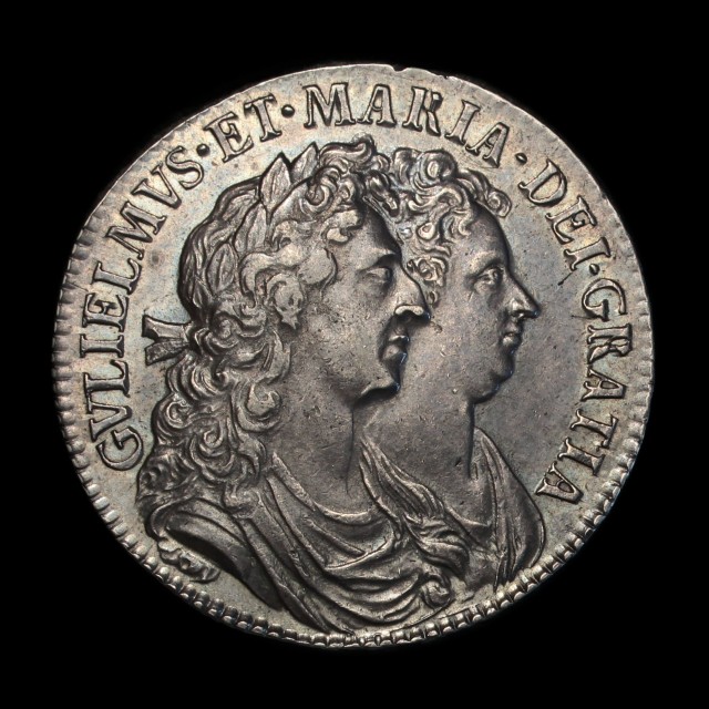 1689, conjoined bust right, rev. crowned shield, caul only frosted, pearls, edge PRIMO, (S.3435, ESC.839)