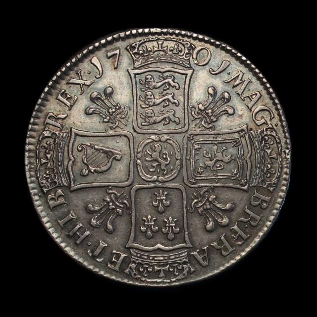 1701, draped bust r., rev. crowned cruciform shields, plumes in angles, edge TERTIO, (S.3496, ESC.1052)