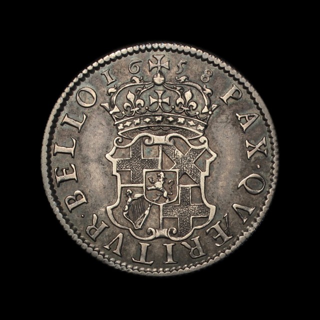 1658, draped laureate bust left, rev. crowned shield (S.3228, ESC.254)