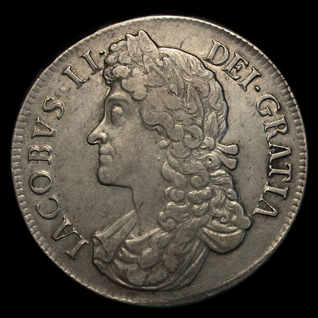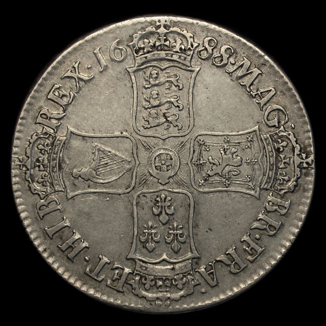 1688/7, second laureate bust left, rev. crowned cruciform shields, edge QVARTO, (S.3407, ESC.747)