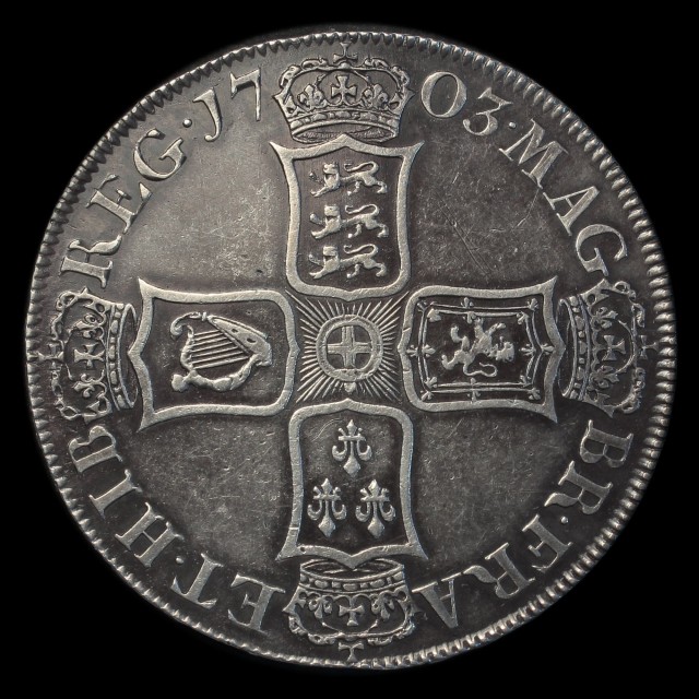 1703, draped bust left, VIGO below, rev. crowned cruciform shields, angles plain, edge TERTIO, (S.3576, ESC.1300). Nicely toned, even wear without adjustment marks often found on this issue, good very fine