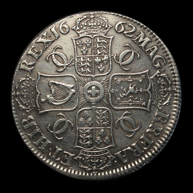 1662, first laureate bust right, rose below, re. crowned cruciform shields, interlinked C's in angles, edge dated, (S.3351, ESC.344)