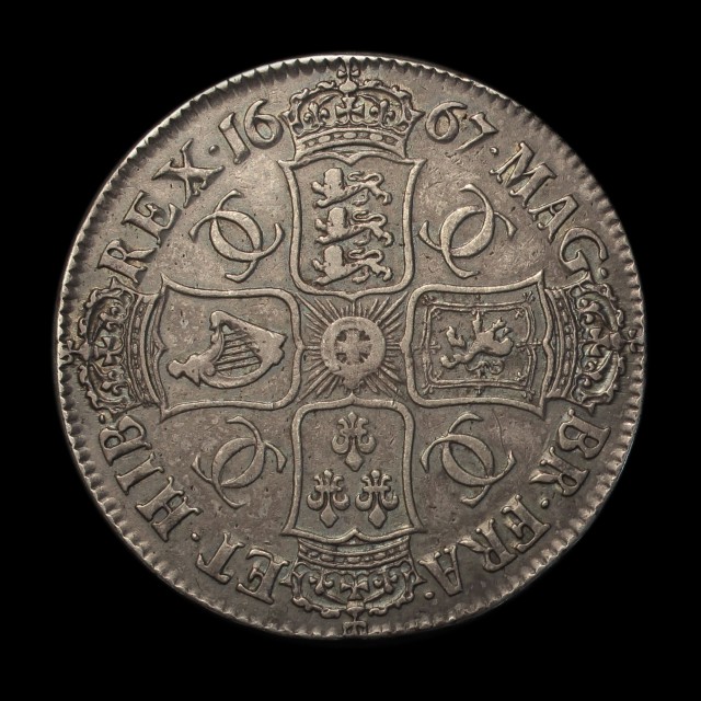 1667, second laureate bust right, rev. crowned cruciform shields, interlinked C's in angles, edge D. NONO, (S.3357, ESC.372)