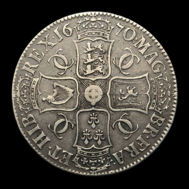 1670, laureate bust right, rev. crowned cruciform shields, interlinked C's in angles, edge V. SECVNDO, (S.3357, ESC.381)