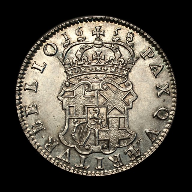 1658, laureate and draped bust left, rev. crowned shield, date above, edge lettered, (S.3227A, ESC.252)